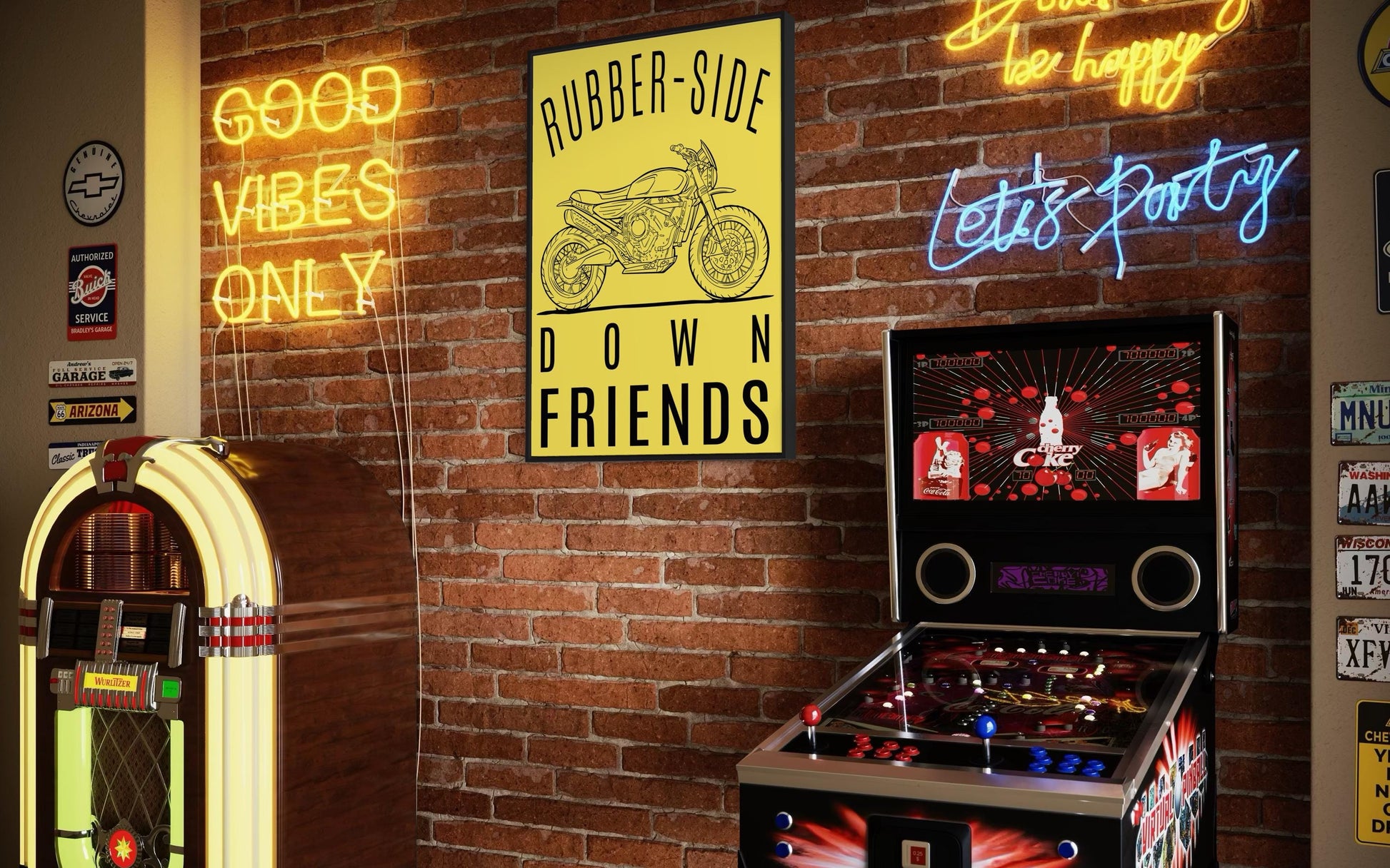 Rubber-Side Down, Friends β Motorcycle Line Art Poster | Bold Yellow Garage Wall Art